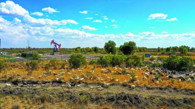 油区牧民在油井周边放羊