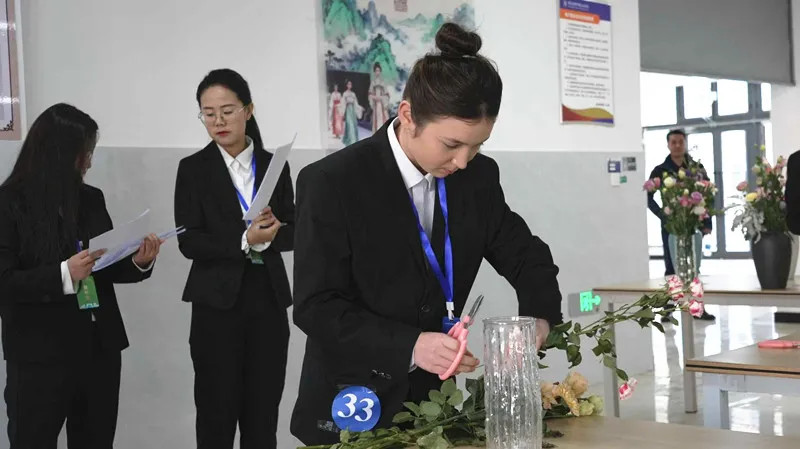 曙光铂尊酒店迎宾胡尼德孜·卡拜说:“第一次参加职业技能大赛中的民宿管家项目,其中有摆台、客房服务和插花三个部分,平时对客房服务的内容接触比较少,花费了一个多月时间练习,这次比赛还是挺有把握的。”