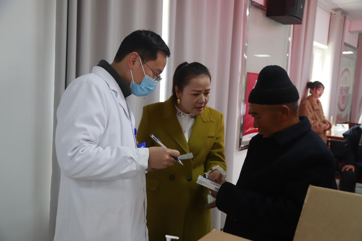 给老人发放药品,并叮嘱怎么服用。(张浩 摄)