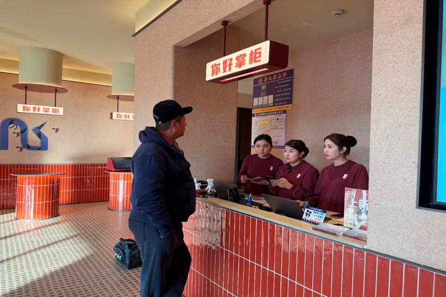 12月3日,在位于六十二团金边新城的华住集团旗下“你好酒店”内,前台工作人员正在为客人办理入住手续。这家今年8月上线的品牌酒店,凭借集团标准化运营管理、庞大会员体系及口岸稳定的商务客流,平均入住率保持在70%以上。