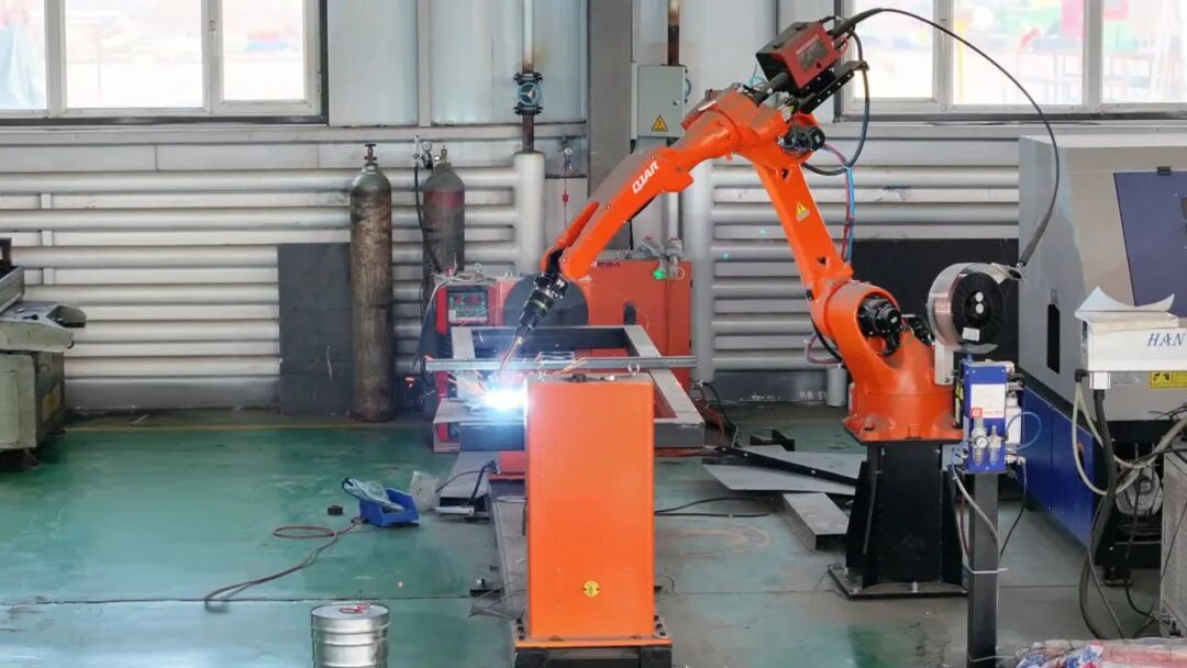 在新疆宏基智能农机装备制造有限公司生产车间,焊接机器人正在进行作业。马金明摄