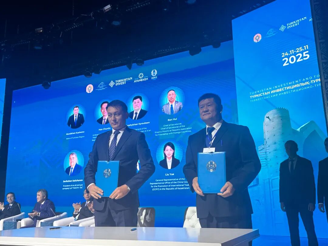 韩波与哈萨克斯坦图尔克斯坦州萨吾然县签订合作协议。韩波供图