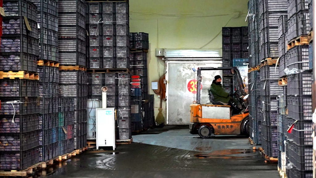 12月11日,冷库内,数千吨阿克苏冰糖心苹果依托先进的冷链技术,实现高标准保鲜储存。(艾海提·毛勒吐尔迪 摄)