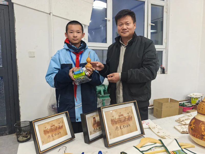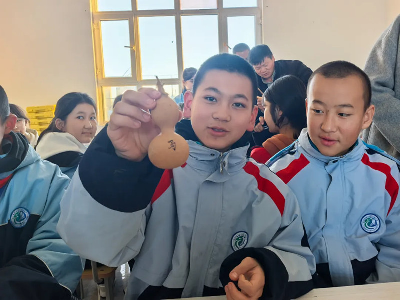 活动现场,学生们神情专注地将心中图景化为烙刻印记,虽然手法略显稚嫩,但那份专注与认真,让人看到了非遗传承的希望。国门初级中学七年级学生杜晓宇高兴地说:“当烙笔触碰葫芦的瞬间,我仿佛触摸到了历史的温度,那些看似平凡的手工艺品,背后却蕴含着深厚的文化底蕴和民族智慧。”