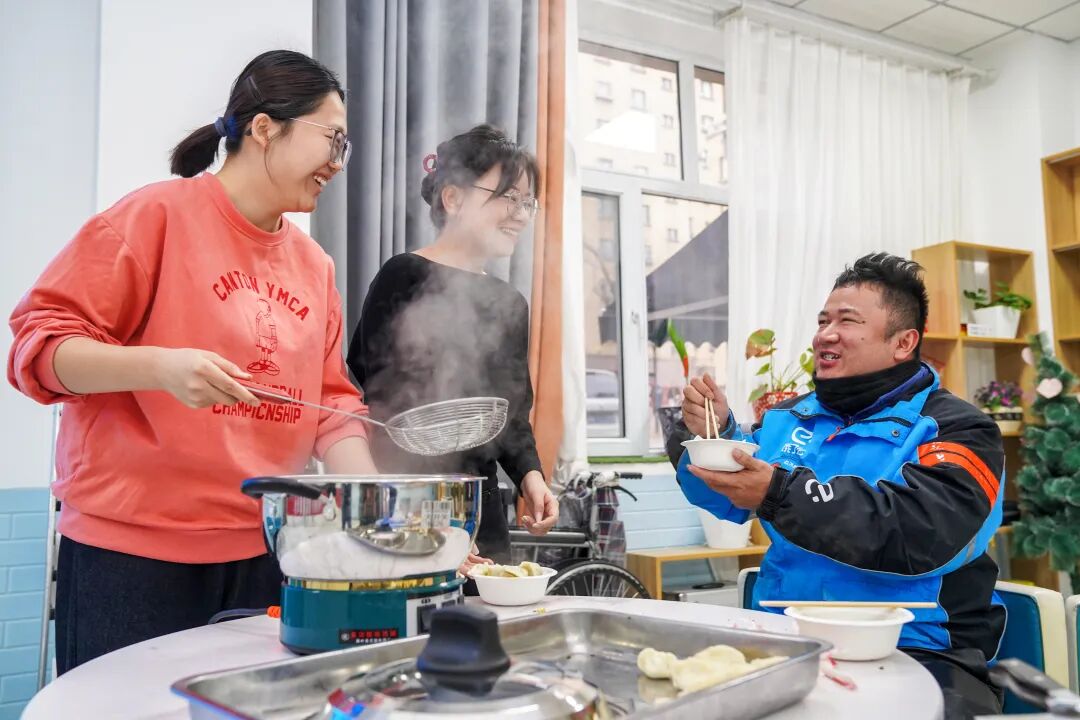 社区工作人员与骑手一起包饺子聊家常。马雪萍 摄