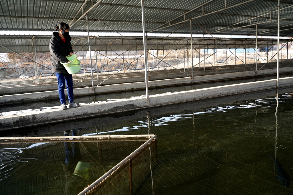 12月16日,饲养员定时定量饲喂冷水鱼。(艾海提·毛勒吐尔迪 摄)