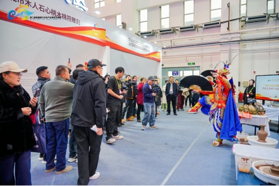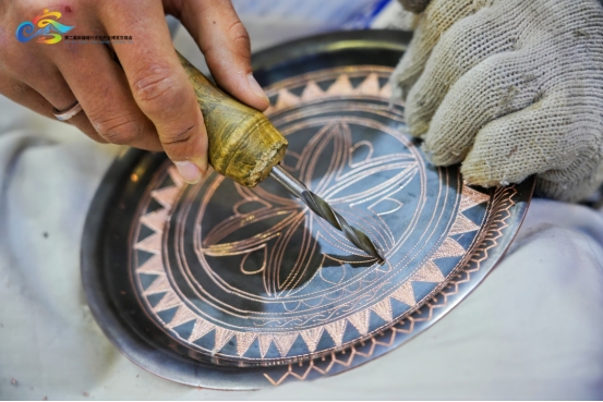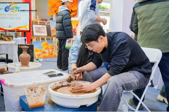 非遗展区内,沉浸式体验吸引不少游客驻足。在土陶制作的工作台前,手艺人指导体验者揉土、拉坯、塑形;铜器制作技艺体验区,观众除了观赏匠人铜器雕花技艺展示,还能接过小锤亲手参与铜器的捶打工序;在塔吉克族刺绣展位可以看到手工艺人现场展示刺绣技艺。