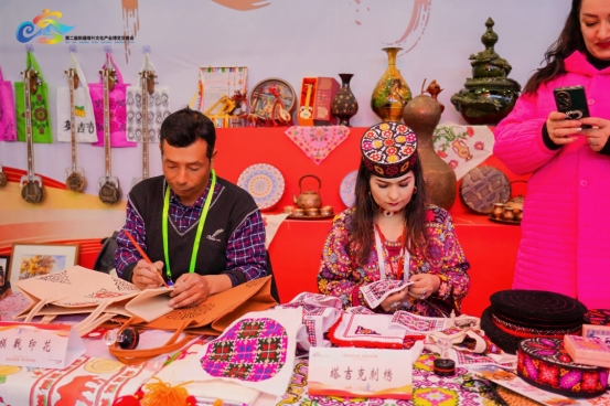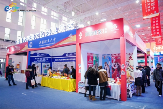 在新疆大学生文化创意展区,来自新疆的高校学生在这里展示了创作的各类文化作品。喀什大学美术学院学生王秉乾说:“这次展会为我们大学生搭建了很好的‘产学研’对接交流平台,让人才能被发现,让创意能够更快进入市场。”