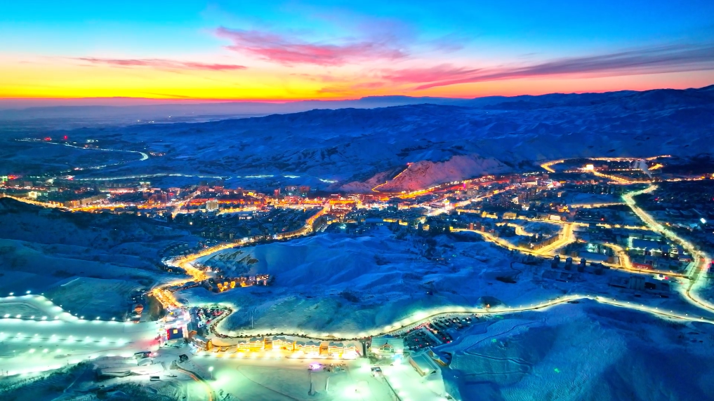 滑雪场灯光亮起,勾勒出雪道的柔和曲线,滑雪者的身影在光影里穿梭,城区的暖光沿着街道铺展,与远处雪山相映,清冷的蓝调中裹着冬季独有的烟火气。