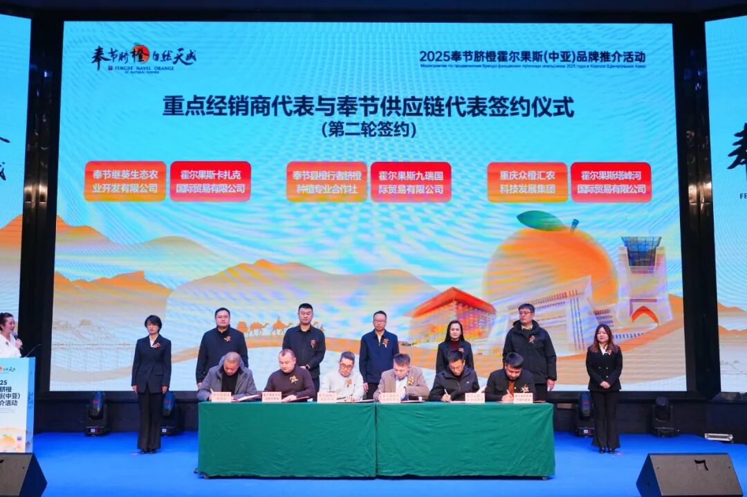推介环节,奉节脐橙所彰显的绿色生态理念、“酸甜适度、细嫩化渣”的卓越品质与现摘现发的供应链优势,赢得了中亚采购商的广泛认可。奉节出口基地经营企业与霍尔果斯卡扎克国际贸易有限公司、九瑞国际贸易有限公司等本地及中亚经销商现场签署多项合作协议,意向采购量达1500吨。