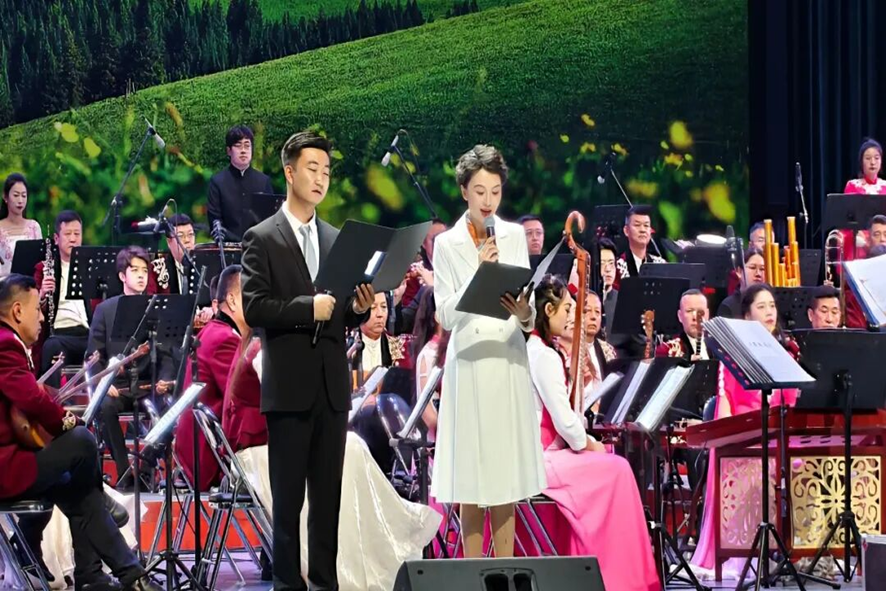 音乐会以“民族交响诗画”为主题,巧妙构思“韵牵丝竹·梦系伊犁”“乐韵共生·山河江南”“同心和鸣·共谱新声”三大篇章。在《序章:诗画伊犁》情景音画的引领下,伊犁的壮丽风光与江南的柔美水韵通过动态投影与悠扬乐声交织呈现,瞬间将观众带入一幅幅动人的音乐画卷。
