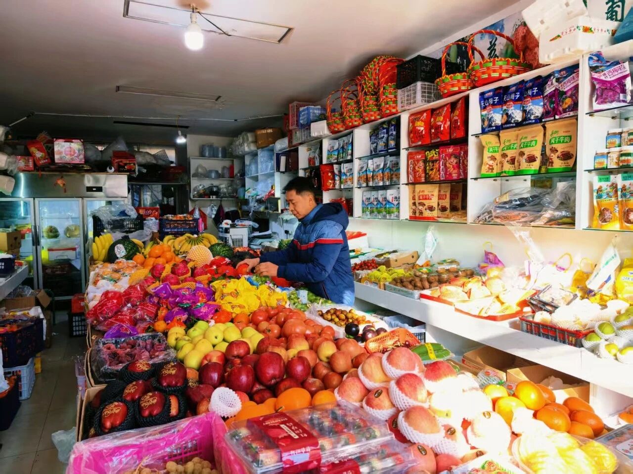 在霍尔果斯开店16年的方胜彬一早便打开了店门,整理货架,将色泽诱人的水果精心摆放,苹果、香梨、葡萄琳琅满目。