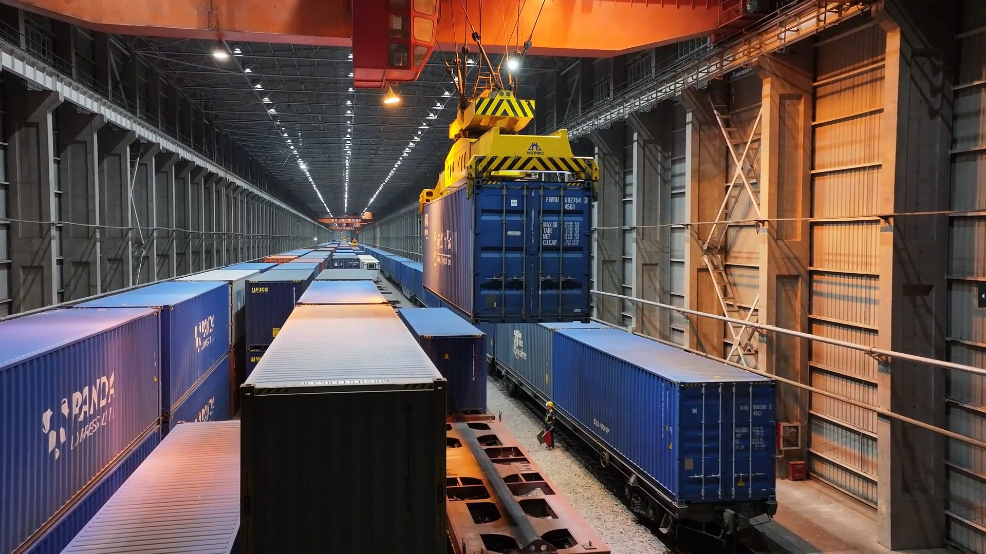 阿拉山口站室内集装箱换装库内,一列入境中欧班列正在换装。龙证宇 摄