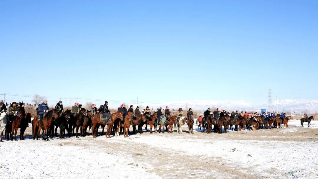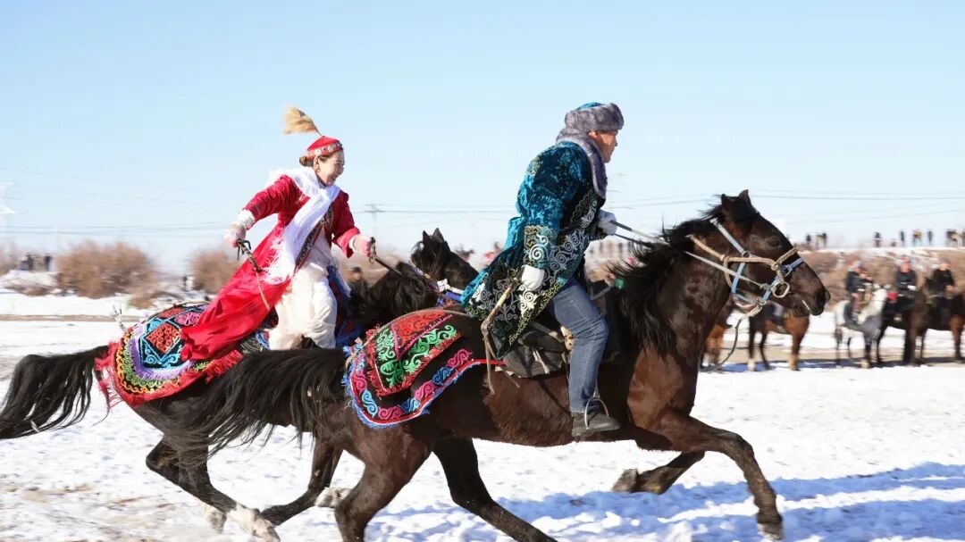 刁羊比赛的余温未散,赛马比赛的战幕便正式拉开,骏马如疾风般奔腾而出,骑手们俯身控缰,在雪道上展开速度的角逐,观众的呐喊助威声此起彼伏,将赛场氛围推向又一个高潮。