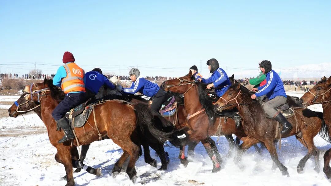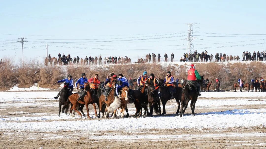 被誉为“草原上的勇敢者运动”的刁羊比赛吸引了大家的目光,随着哨声响起,骑手们如离弦之箭般冲向场地中央的羔羊,马蹄踏碎积雪,溅起漫天雪雾。在这场集速度、力量与智慧于一体的较量中,骑手们各施绝技,有的俯身马背,以“海底捞月”之姿精准抓羊;有的侧挂马身,用“镫里藏身”绝技躲避围堵。抢到羊的骑手则迅速将羔羊牢牢夹在蹬带下,或从鞍后灵活换手,防止对手抢夺。