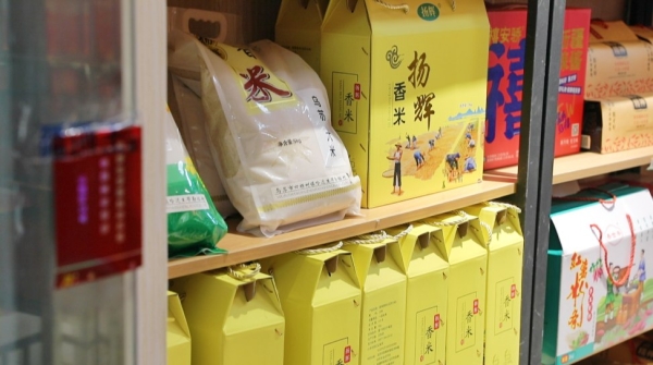 货架上展示各种包装的四棵树大米。李莫然摄