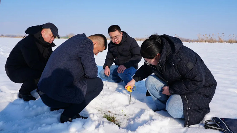 农技人员分工协作,有的测量雪层厚度并记录数据,有的拨开积雪查看麦苗分蘖情况,有的用工具探测冻土层深度,每一项操作都细致严谨。“你这片麦子是11月中旬播种的,苗情整体健壮,但今年冬天气温偏高,要控旺促弱,做好保墒工作,如果后续出现寒潮降温天气,记得开春提前破雪施肥,保证麦苗的二次生长。”农技人员一边查看麦苗长势,一边向于向龙叮嘱。