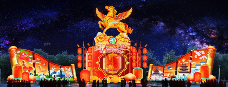 “今年的灯会以马文化为主题,增加了大量游客互动元素,灯组体量较去年大幅提升。”项目经理李涵介绍,水上灯组从去年的25米扩展至40米,互动灯组也从往年小型打卡灯组升级为20米体量,让游客能获得“与灯融为一体”的沉浸式体验。“主灯延续前两届生肖文化主题,采用金色飞马造型,下方搭配传统走马灯,整体设计为灯笼样式。灯笼中间可旋转,图案选用《千里江山图》,寓意中华大美河山。”
