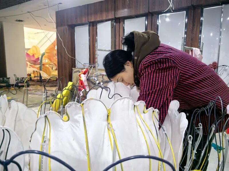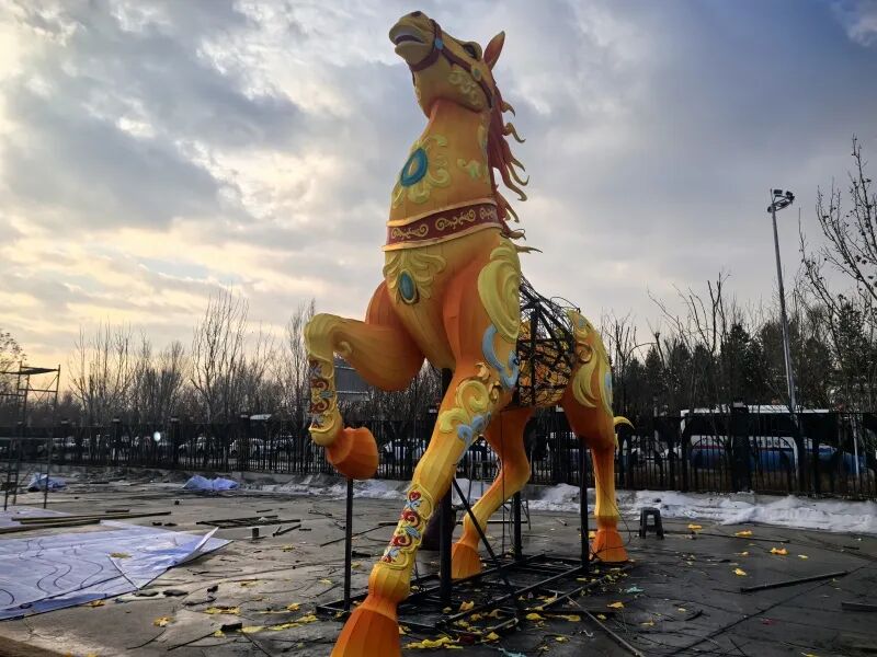 1月14日,在七彩广场附近的灯彩制作区,放样、焊接、造型、裱糊、美工……手工艺人分工明确、默契协作,现场一派繁忙景象。这批工人从1月初便投入灯彩制作,经过多道精细工序,骏马、鳌鱼、荷花、锦鲤、小鹿、马车等多元元素的灵动轮廓已初步勾勒,覆以色彩艳丽的丝绸面料、装入LED灯珠后,一个个雏形初现的灯组颇具神韵。