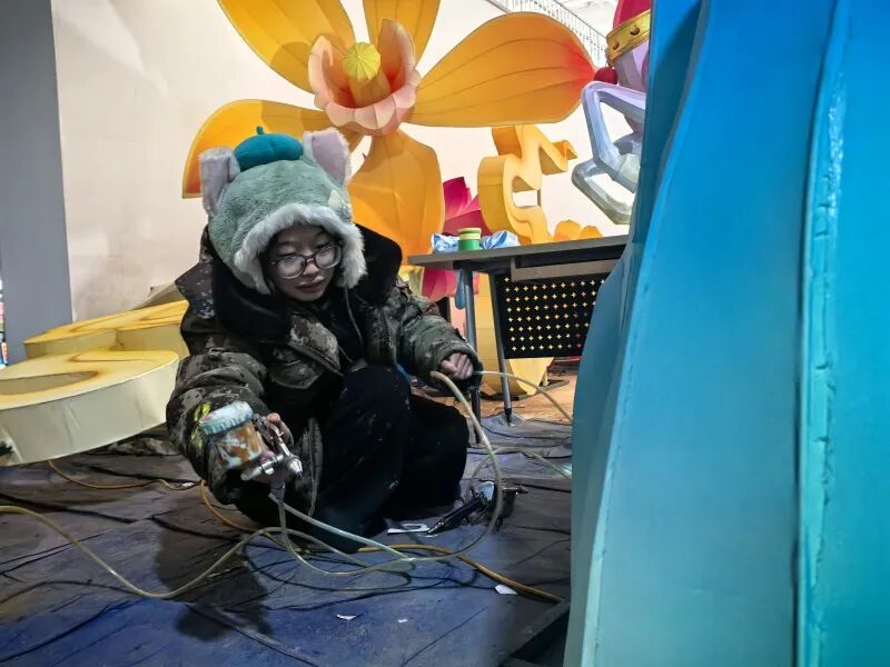 “00后”美工师郭宇欣正在为灯彩喷色