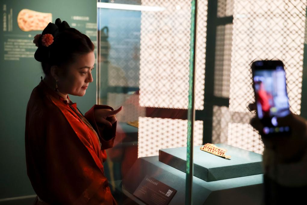 1月20日,观众在公元5至6世纪的镶嵌红宝石金剑鞘展柜前拍照留影。新华社记者 王翔 摄