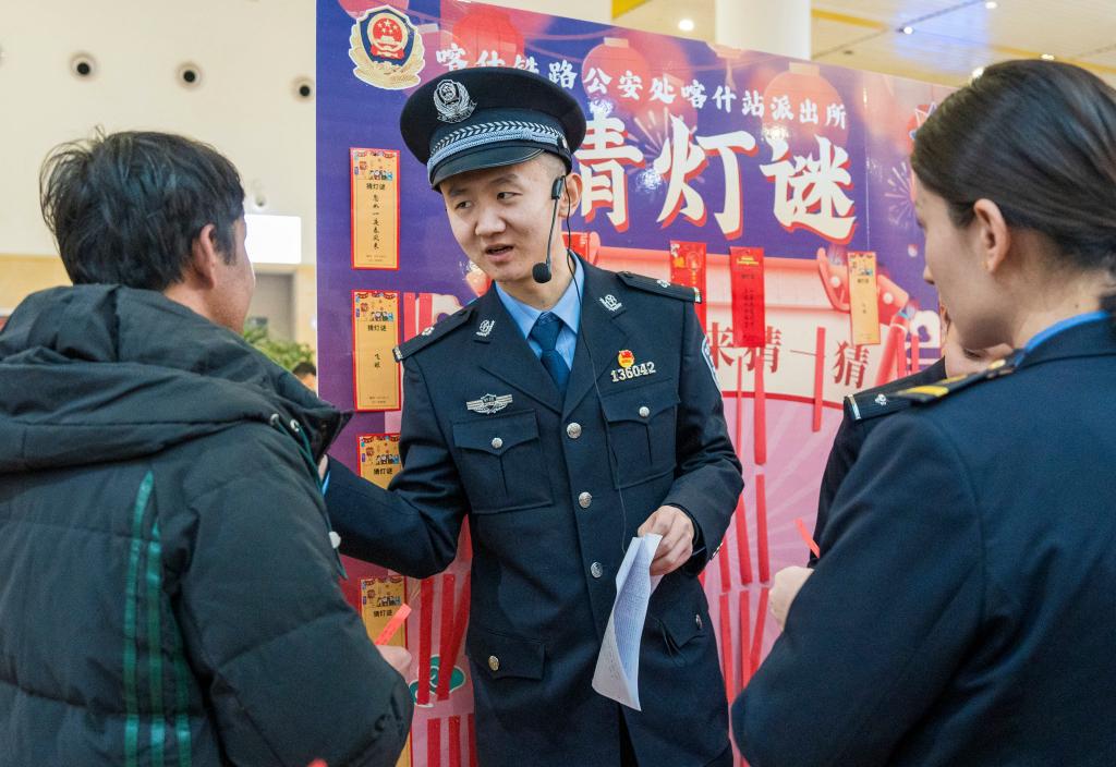 1月30日,在喀什铁路公安处举办的“情满喀什站,警暖回家路”安全出行宣传活动中,旅客参与猜灯谜活动学习安全出行知识。