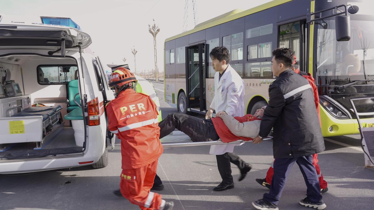 演练现场模拟一辆载有15名乘客的公交车与小型轿车在结冰湿滑路面上发生碰撞的紧急情况。接到报警指令后,交警、应急救援、120急救、交通执法等部门迅速响应、各司其职、密切配合,快速抵达现场开展处置工作——救援人员全力抢救伤员、转移被困乘客,医护人员现场进行急救处置并转运伤员,交警有序封锁现场、疏导交通,执法人员开展现场勘查,整个处置过程规范高效。