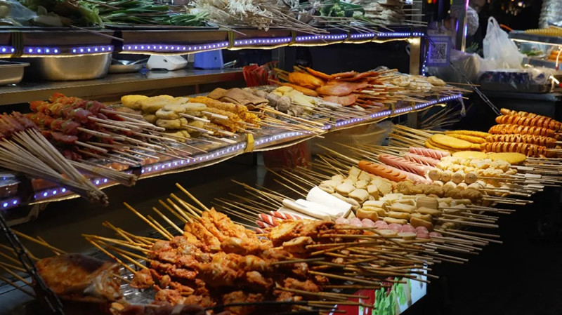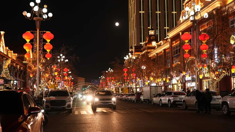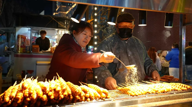 晚上8点,友谊路步行街迎来了一天最热闹的时刻,烤肉、烤面筋、手工酸奶、麻辣烫等特色小吃一字排开,热气腾腾的美食驱散了冬日的寒意。市民和游客三五成群,或品尝美食,或选购商品,或驻足拍照,街道上弥漫着浓浓的烟火气息。