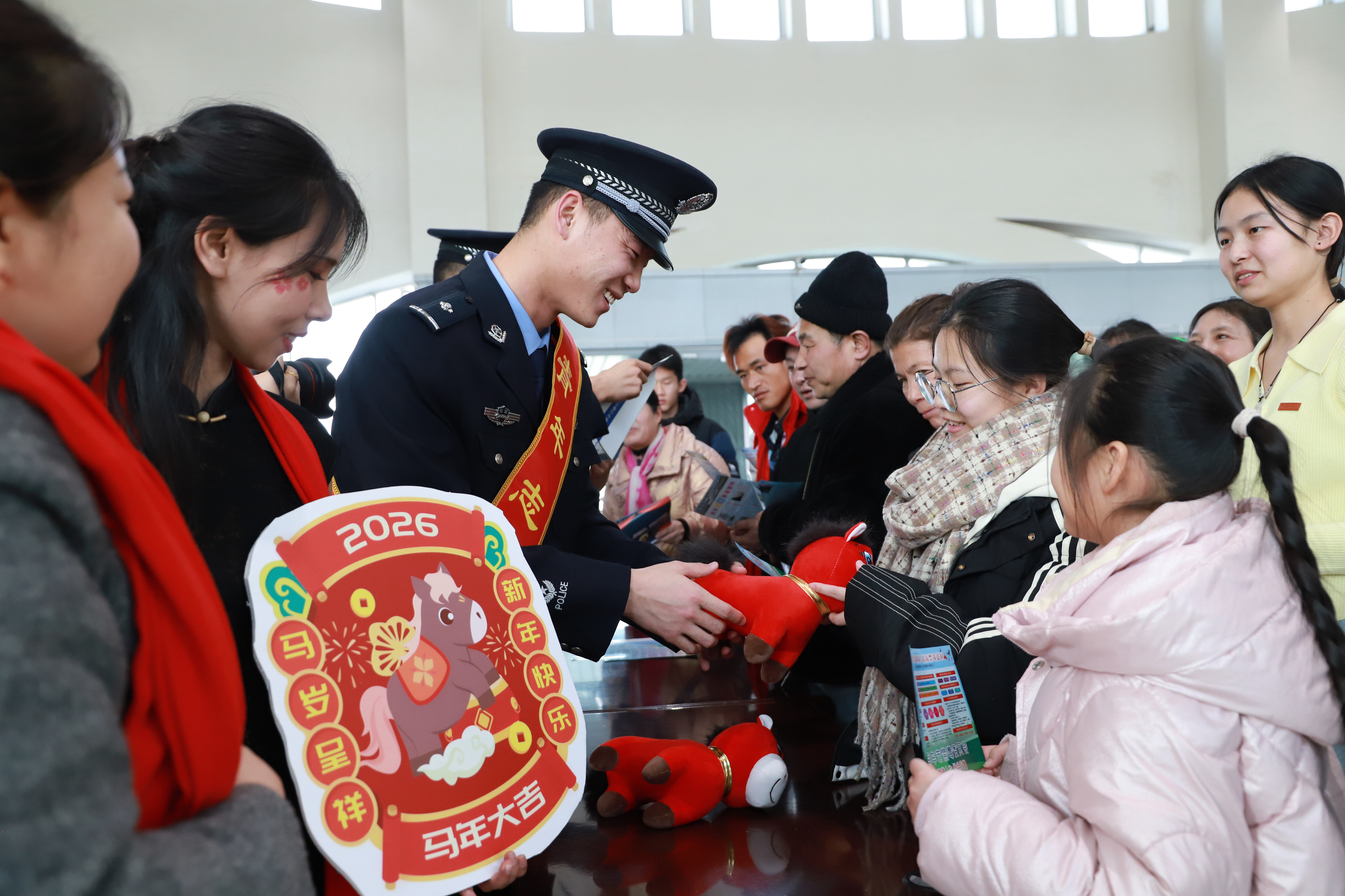 日头渐高,客运部门送来红灿灿的福字,民警们挨个儿送到旅客手中,同步送上“祝您马年大吉,平安到家!”的祝福。藏蓝警服、鲜红福字与旅客笑脸相映,定格成春运最暖画面。山东旅客捧着福字笑言:“学了安全知识还收了新年祝福,这趟出行真是福气满满,你们民警既有心又用心!”