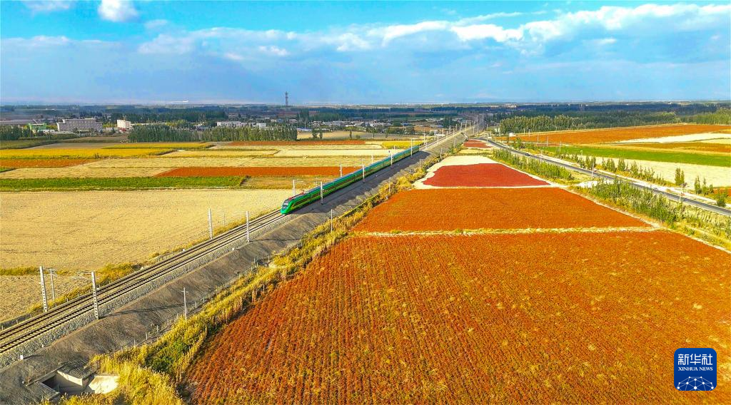 在新疆焉耆,列车从一片辣椒地旁驶过(9月30日摄,无人机照片)。新华社发(杨志荣 摄)