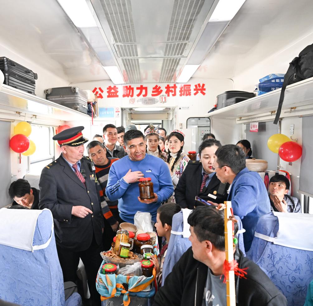 列车缓缓驶出莎车站,喀日所在的11号车厢很快满员。按照惯例,当天是列车上的“巴扎日”。为了帮助沿线居民增收致富,自2021年起,列车长会根据农时、客流等实际情况,在车厢里定期组织“流动巴扎”。当欢快的“麦西来甫”乐曲响起时,沿线上车的乡亲们纷纷拿出干果、果酱、木碗、木勺等家产物品,摆放到小车上,在列车员帮衬下吆喝叫卖,被吸引的旅客则围拢过来挑选和询价,车厢里顿时乐声、笑声一片。