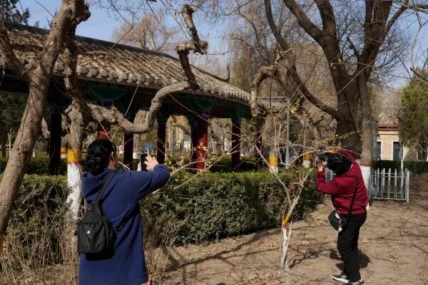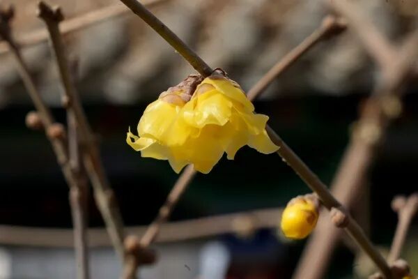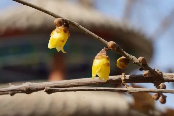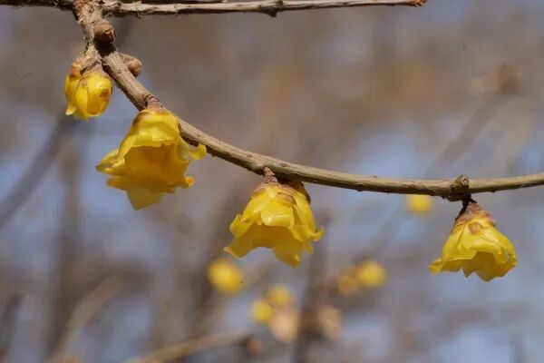 3月6日,在库尔勒市人民广场,一朵朵娇小的腊梅花竞相绽放,黄灿灿的花朵缀在枝头上,犹如蜜蜡般莹润。(记者 马丽娟)