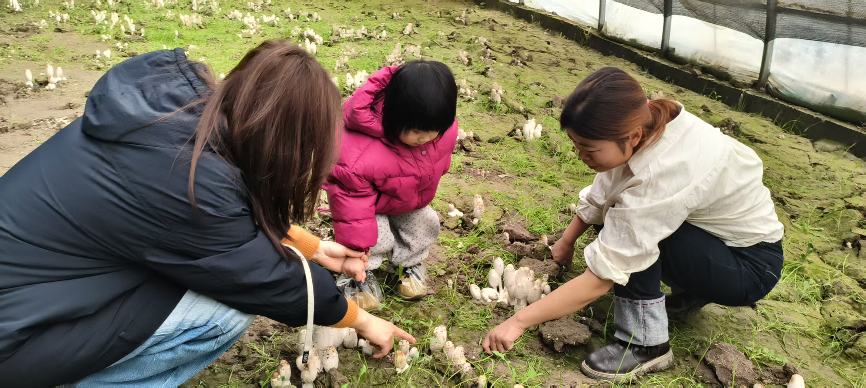 采摘现场,小朋友们沉浸在故事里才有的采蘑菇快乐中,家长们提着刚摘下的新鲜蘑菇,围在一起商量回家怎么烹饪才最鲜,是炒还是炸,热闹又温馨。