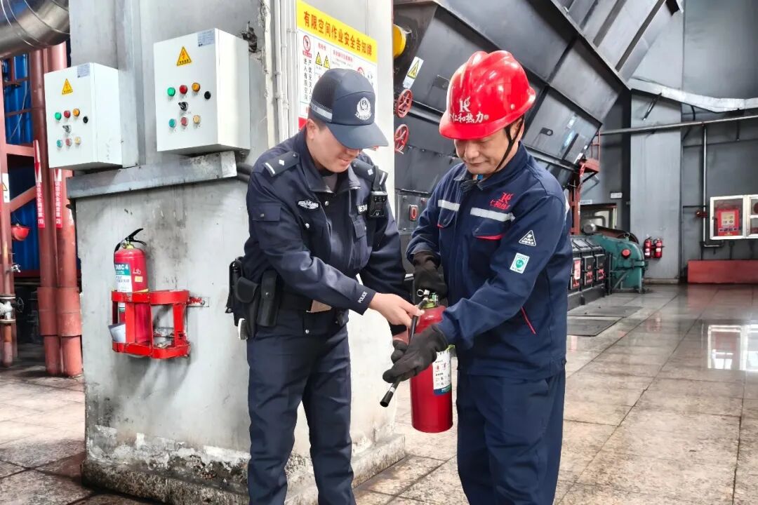 民警在热力公司指导员工使用灭火器。郭小兰 摄