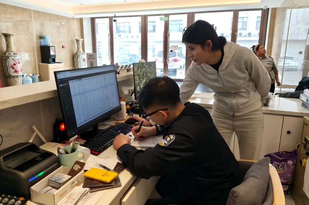 民警在酒店前台仔细核对人员入住登记信息。郭小兰 摄