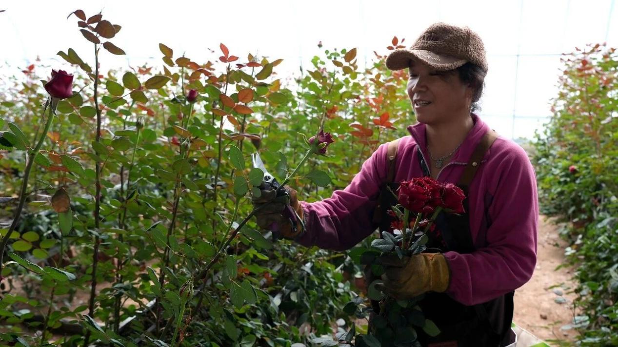 走进大棚,艳红的高原红、复古的卡布奇诺、淡雅的爱莎……十余种鲜花争奇斗艳,工人们正在修剪、捆扎,动作麻利而细致。