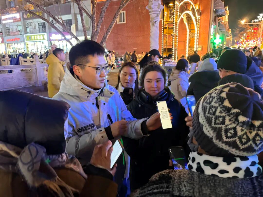 (卡拉苏社区干部扫码解惑,引导商户规范经营。刘玉龙 摄)