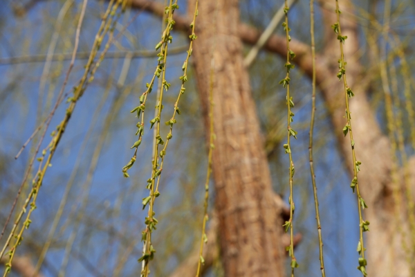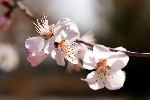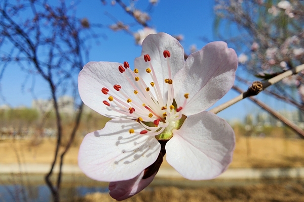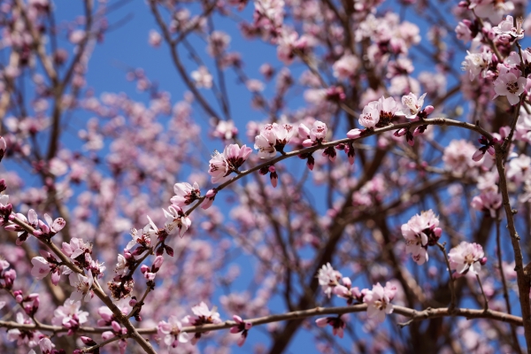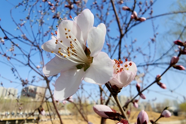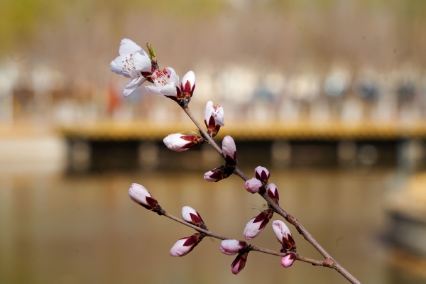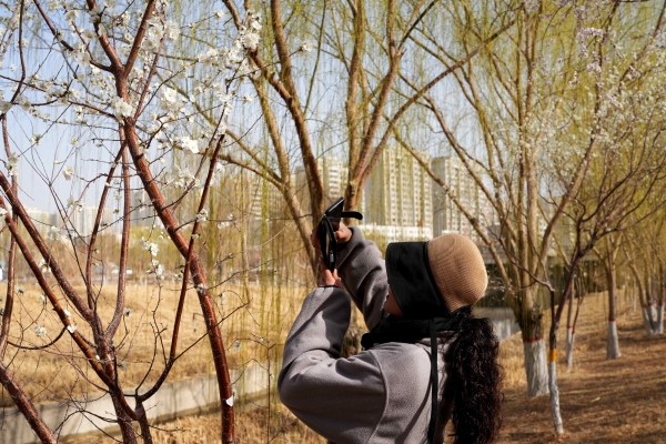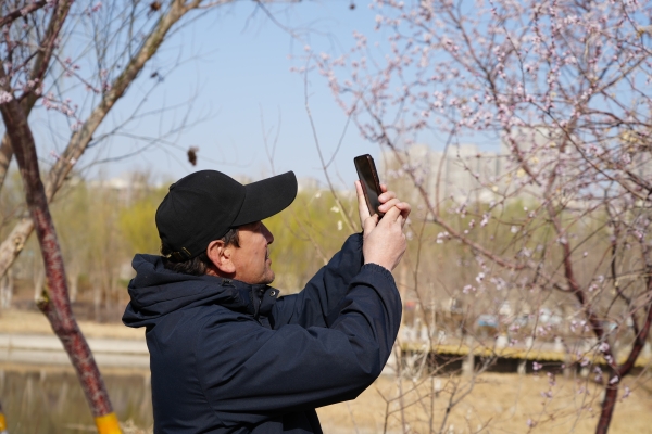 3月13日,库尔勒市各个景区河道、道路旁,杏花、桃花开得正艳,花朵层层叠叠缀满枝头;柳树抽出翠绿新枝,在阳光下随风摆动,市民穿梭于树下,感受久违的绿意,处处传递着春的气息。(记者 马丽娟)