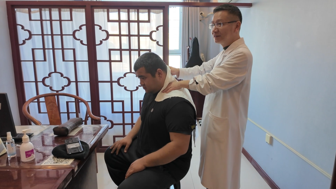 医生为外籍患者进行颈部推拿理疗。布仁巴特 摄