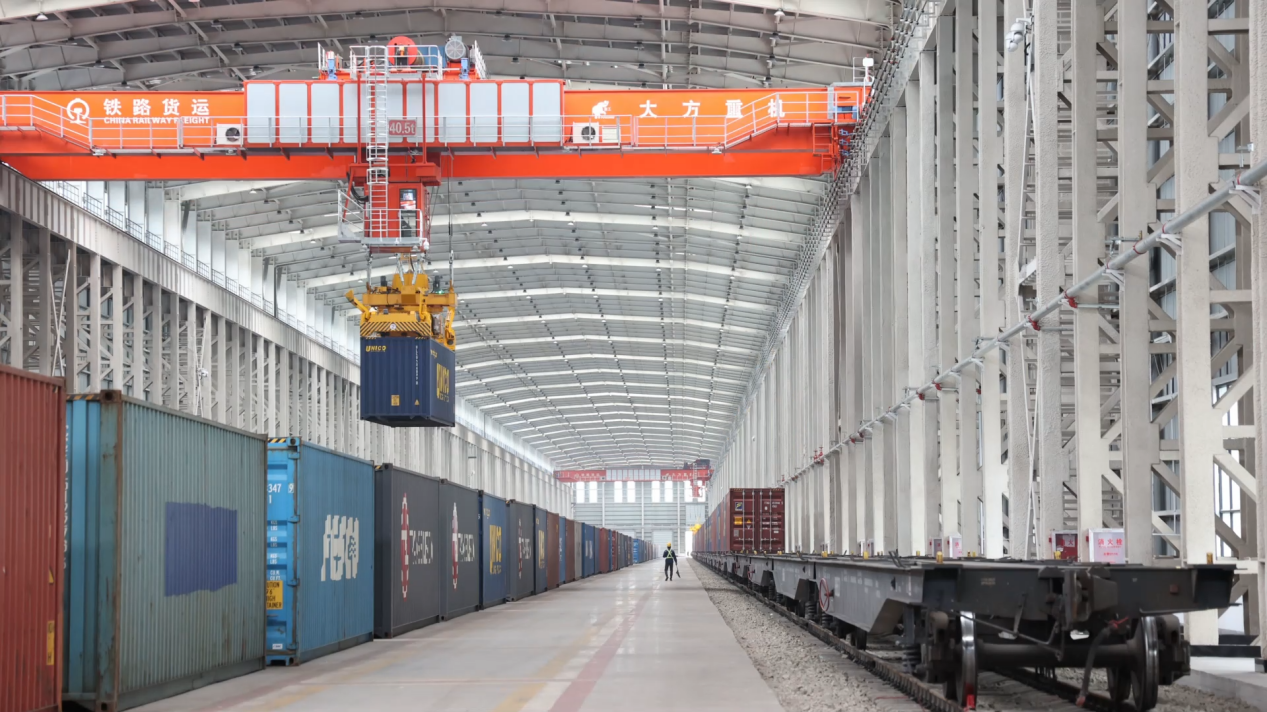 阿拉山口站室内集装箱换装库内,一列入境中欧班列正在换装。阿拉山口市融媒体中心供图