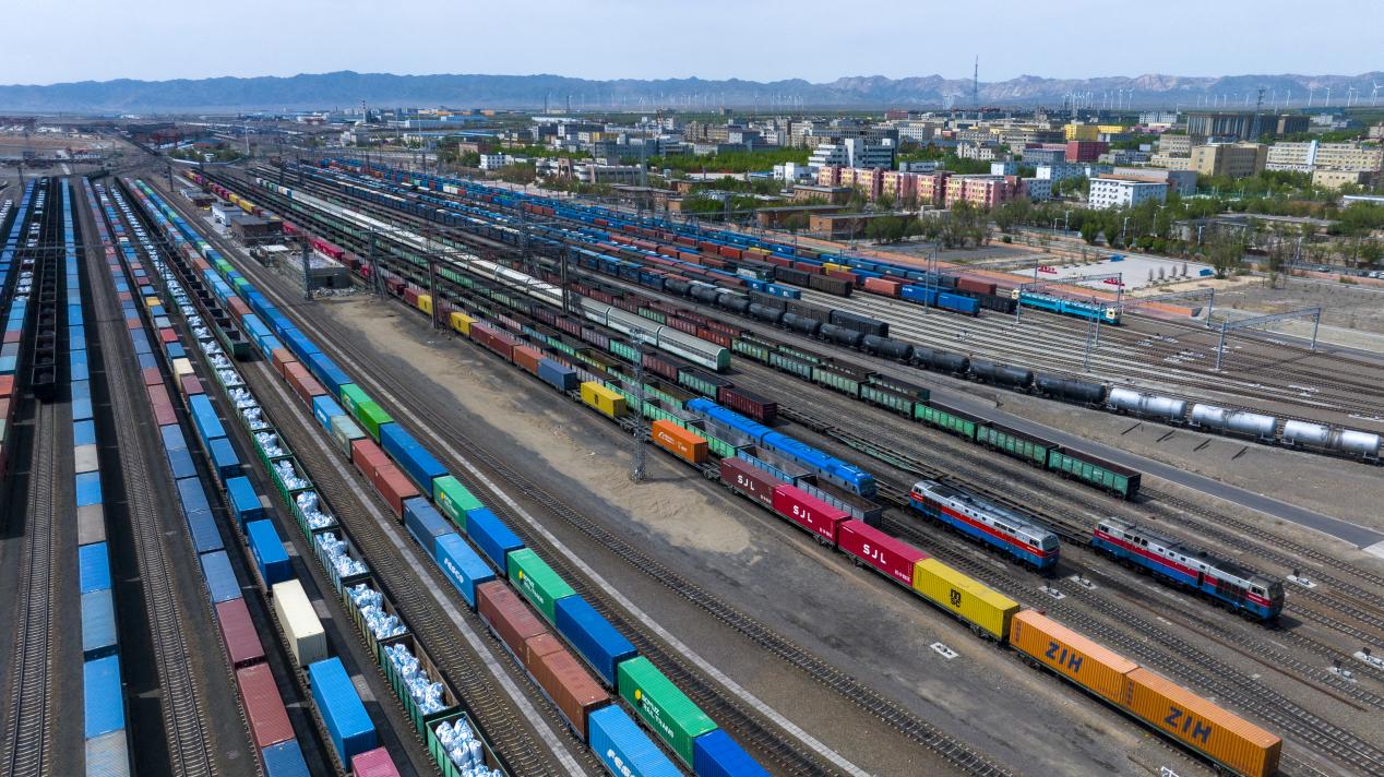 阿拉山口站编组场内出入境中欧班列及其他货运列车正集结待出发。阿拉山口市融媒体中心供图