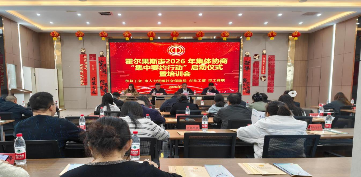 为深入推进和谐劳动关系建设,切实维护职工合法权益,助力企业健康发展,霍尔果斯市总工会联合市委社会工作部、市人社局、工商联召开2026年集体协商“集中要约行动”启动仪式暨培训会,明确年度工作重点,推动全市集体协商提质扩面、走深走实,以和谐劳动关系护航高质量发展。