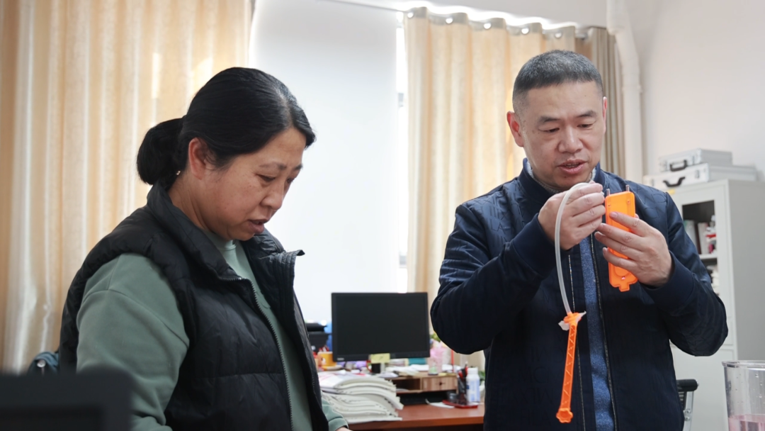 江平波与同事交流教学教具。龙证宇 摄