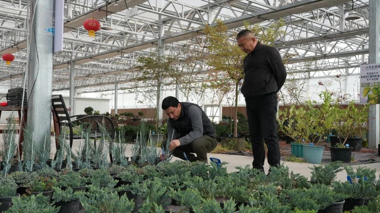 3月23日,在霍尔果斯景瀚生态园林绿化有限公司苗木大棚里,来自乌兹别克斯坦的客商纳孜孜·玉素甫正在了解苗木的长势和品类,对这里的规模化种植和精细化管理表示认可。