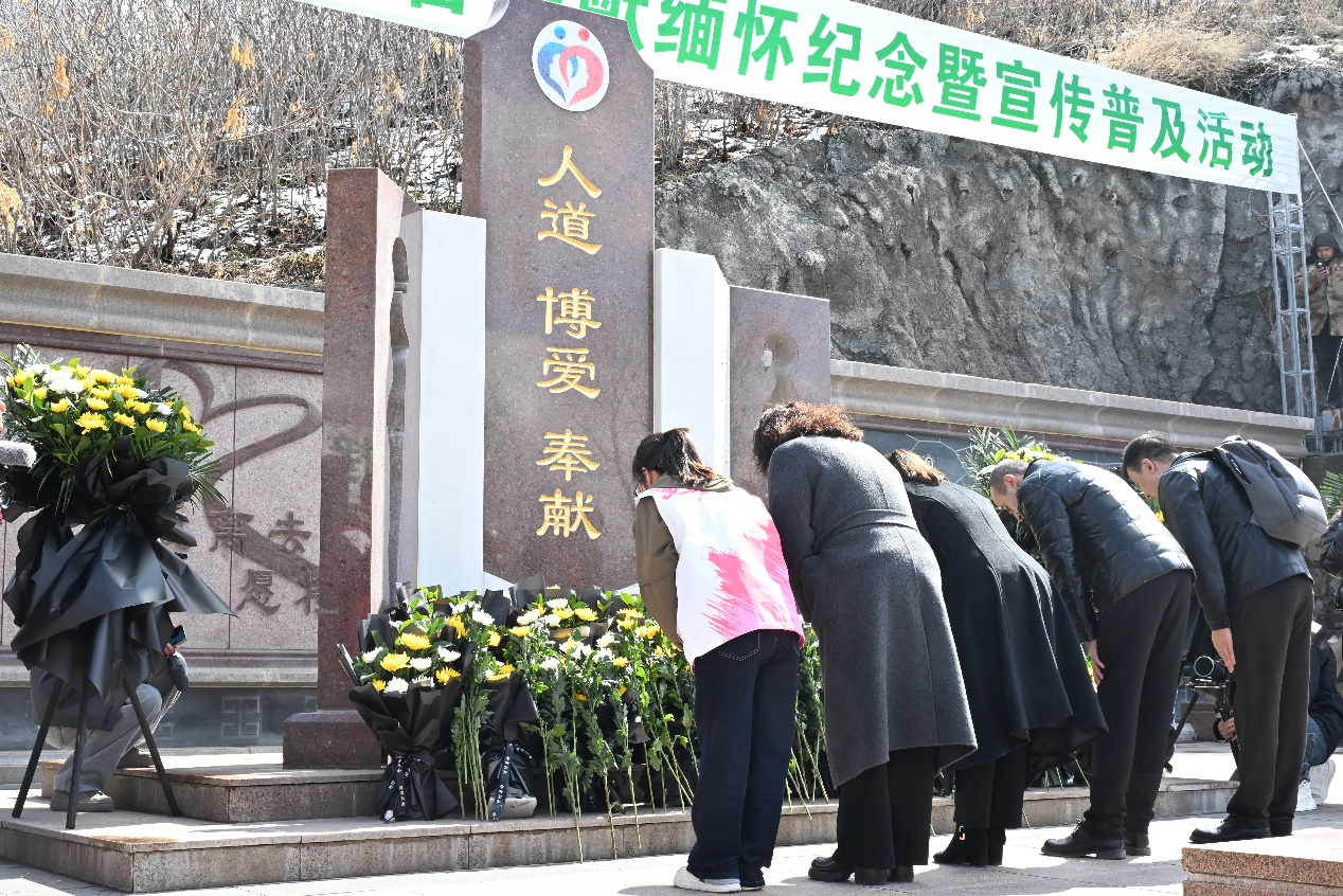 图为活动现场人员向器官捐献志愿者敬献鲜花。