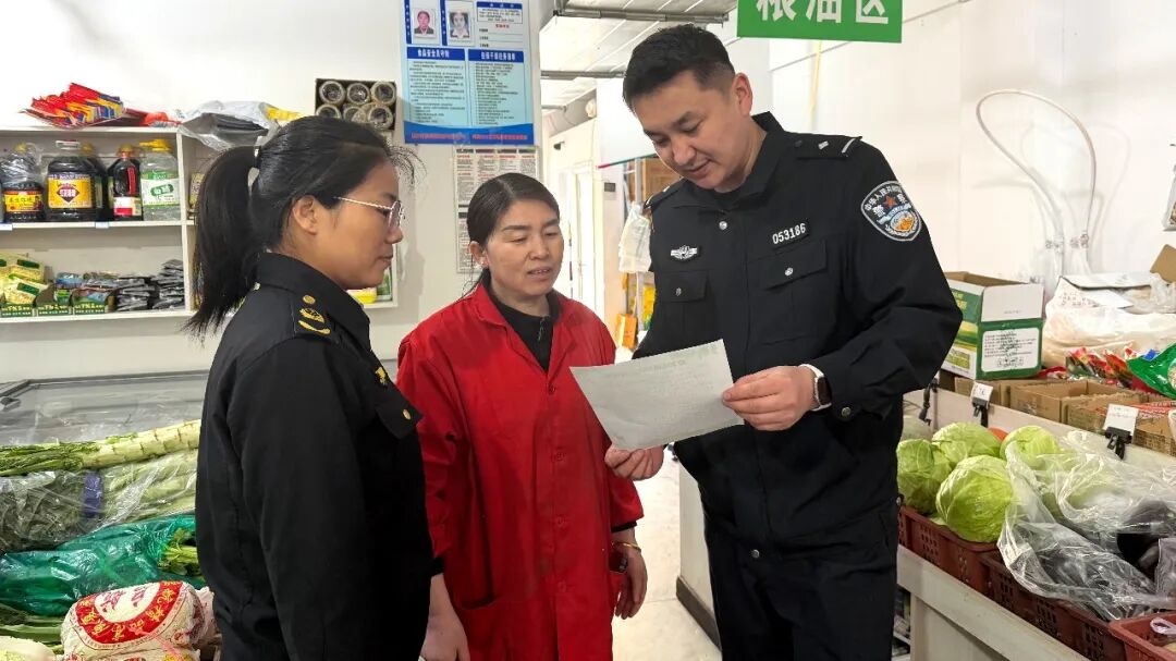 民警与市场监管执法人员向经营户讲解食品安全相关规定。张雪 摄