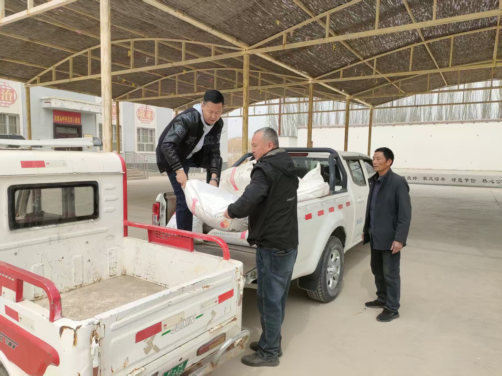 近日,博湖县委政法委、县市场监督管理局、县公安局、县技工学校驻查干诺尔乡敦都布呼村工作队为该村村民免费发放农资,助力村民春耕生产。