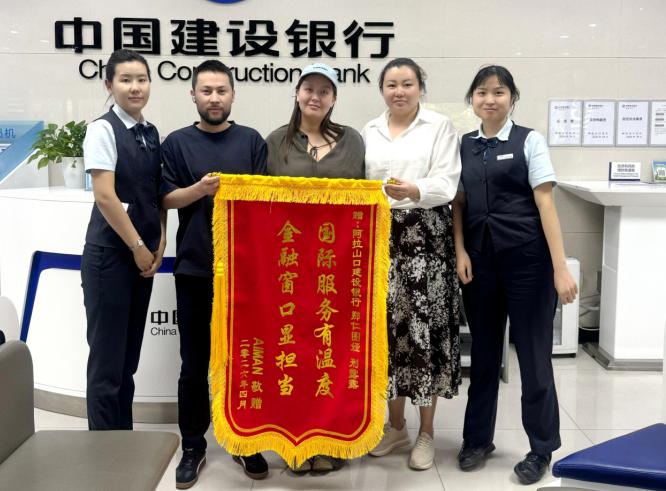 近日,5名外籍人员将一面特意定制的印有“国际服务有温度 金融窗口显担当”字样的锦旗,专程送到建行阿拉山口支行,以此感谢支行员工的主动担当与贴心服务。