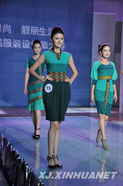 这组作品灵感来源于维吾尔族男士服装上的十字绣,把男士服装上的十字绣运用到了女式服装上,这对于现代女士来讲是不一样的尝试。绿色是夏季的主要颜色,更是环保的代言词,让绿色的面料与十字绣图案结合,形成清爽的、具有民族特色的成熟女装。