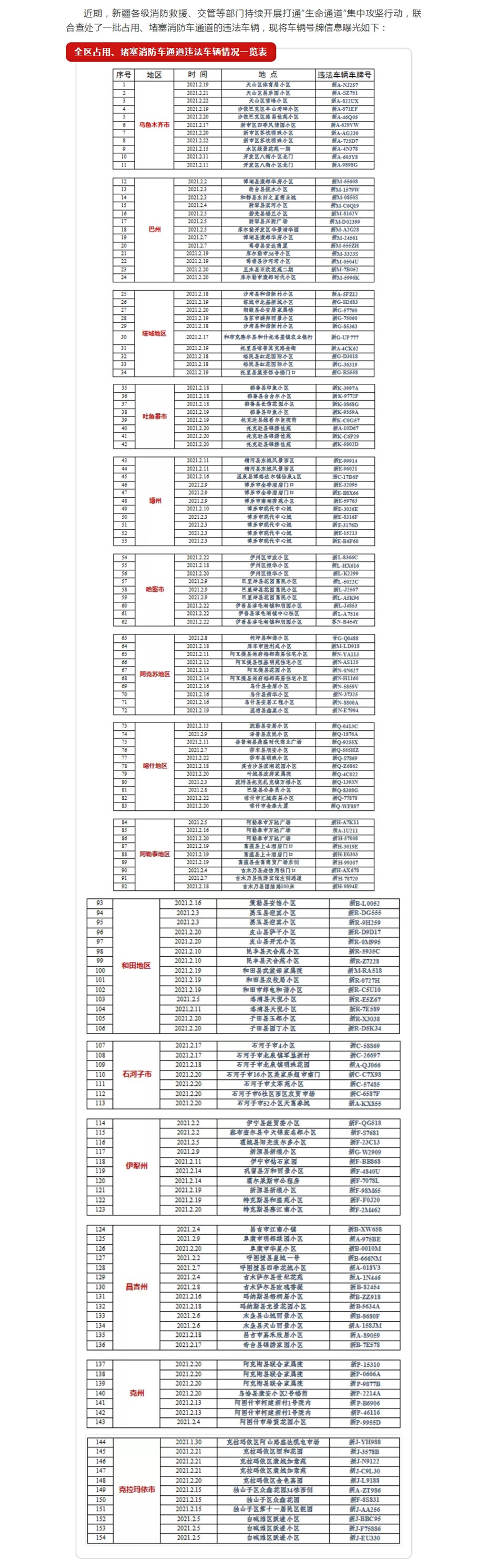 全疆堵占消防车通道违法车辆曝光台
